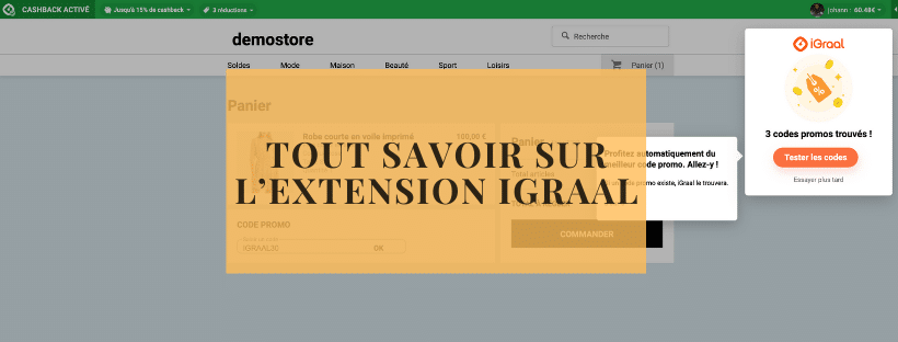 Comme le propose l’extension Wanteeed, iGraal propose une extension code promo qui permet de chercher automatiquement pour vous les meilleurs codes promos. Ainsi avec l’extension vous pouvez cumuler code promo et cashback depuis une seule extension.